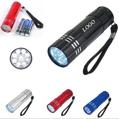 the Aluminum LED Torch with 9 Ultra-bright White LED Lights & 3aaa Batteries. Push-button on & Off Switch on End. Features Nylon Wrist Lanyard. Convenient to Take & Give-away for Safety Events & Outdoor Activities.