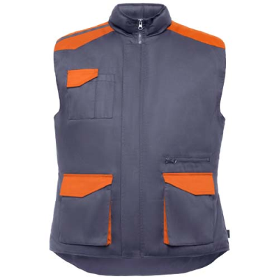 Multipocket Work Vest in Two-Colour Combination, with High Collar. Front Zip with Hook & Loop Fastening. Windbreakers in Cuffs. Right Side Outer Phone Pocket with Flap & Hook & Loop Fastening. Two Pleated Front Pockets with Flap & Hook & Loop Fastening. Two Pen Pockets. Inside Pocket with Hook & Loop Fastening. Zip Pocket. Drop Tail. Automatic Adjuster. Contrasting Shoulder Pieces & Details. Minimum Quantities Apply.