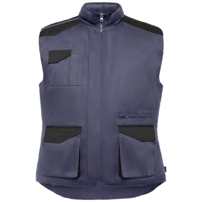 Multipocket Work Vest in Two-Colour Combination, with High Collar. Front Zip with Hook & Loop Fastening. Windbreakers in Cuffs. Right Side Outer Phone Pocket with Flap & Hook & Loop Fastening. Two Pleated Front Pockets with Flap & Hook & Loop Fastening. Two Pen Pockets. Inside Pocket with Hook & Loop Fastening. Zip Pocket. Drop Tail. Automatic Adjuster. Contrasting Shoulder Pieces & Details. Minimum Quantities Apply.
