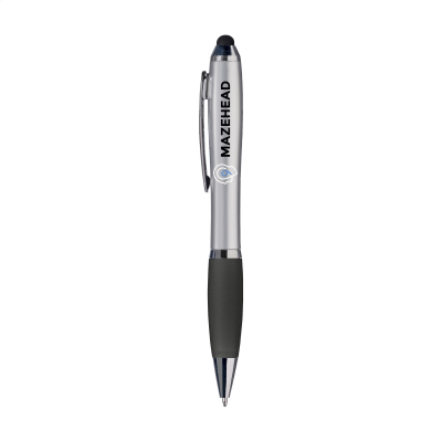 Blue Ink Ball Pen with Colour Rubber Top & Pointer to Operate Touch Screens (Eg Iphone & Ipad), Metallic Look Barrel, Non-Slip Grip, Recess in Metal Clip & Twist Mechanism. Minimum Quantity: 1