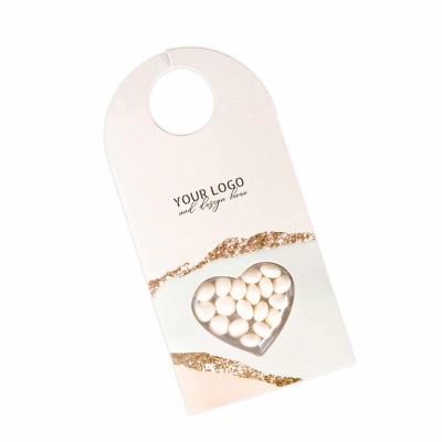 Dragees Push the Button Hanger - Heart Contents: 5 G of Dots Pastilles Flavor: Mints, Fruit, Mix of Flavors Product Option: 4 Shape to Choose From, White or Kraft Paper Additional Information: White Paper by Default, Kraft Paper Optional Minimum Quantity: 1000