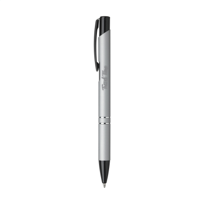 Blue Ink Ball Pen with Black Painted Push Button & Clip & Tip, Silver Chrome Interlaces. the Barrel is Finished with a Rubber Finish. Minimum Quantity: 1