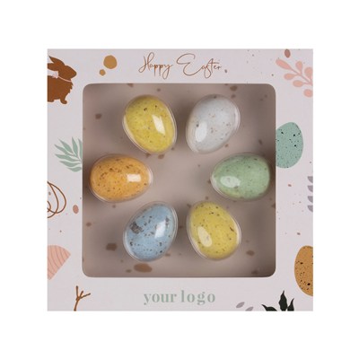 Freckled Mini Eggs Set of Chocolate 6 Pcs About the Product: Freckled Mini Eggs Chocolate Set – 6 Pcs – Milk Chocolate Mini Eggs in a Colored Shell A Vibrant Colour Palette & the Sweets Taste of Milk Chocolate with a Nut Filling Inside a Crunchy Sugar Shell Make the Freckled Mini Eggs Chocolate Set (6 Pcs) an Excellent Attention-Catching Gift in Any Business Context. Six Assorted Mini Eggs Look Fresh & Visually Appealing, Creating a Striking Easter Trim That Reinforces Positive Associations with Your Brand. This Set is Ideal for Companies Seeking an Elegant, Light, & Modern Form of Springtime Gifting. Freckled Mini Eggs Chocolate Set – 6 Pcs – Eco-Friendly Packaging & Full Personalization The Packaging — Available in White Paper, Kraft Paper, or Ecru Paper with Grass Fibers — Provides an Attractive, Eco Friendly Base for Branding. Inside, the Mini Eggs Are Arranged in an R-Pet Tray Made From Recycled Materials, an Important Element in B2b Communication Thanks to Its Clear Transparent Eco-Message. Personalized Print, Dedicated Graphics, or a Holiday-Themed Promotional Message Give the Gift a Professional Character & Make It Perfectly Suited for Spring Marketing Activities. Recommended Business Occasions: • Corporate Holiday Gift Sets for Partners & Contractors • Easter Mailings for Clients as Part of Seasonal Campaigns Contents: Assortment of 6 Chocolate Mini Eggs (Total Weight 63 G) Flavor: Milk Chocolate in a Sugar Shell, Mix of Colours Product Option: Optional Double-Sided Print, White Paper by Default, Kraft Paper & Ecru Paper with the Addition of Grass Fibers Optional Additional Information: Molding Made of R-Pet (Recycled Pet) Minimum Quantity: 100