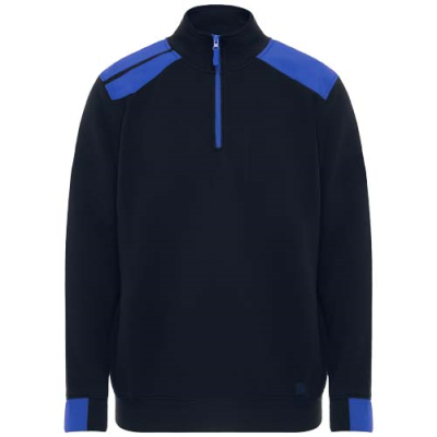 Half Zip Sweater in a Colour Combination Design, with High Collar. Reinforced Covered Seams on Inner Collar. Contrasting Shoulders & Details. Half Cuff & Hem in 1X1 Ribbed Fabric. Minimum Quantities Apply.