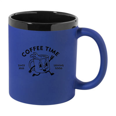 Ceramic Pottery Mug with Soft-Touch Rubber Finish & Black Inside & Rim, 300 Ml. with Special Coating for Engraving, the Engraved Logo is Matching the Inside Colour. in Kraft Paper Box. Minimum Quantities Apply.