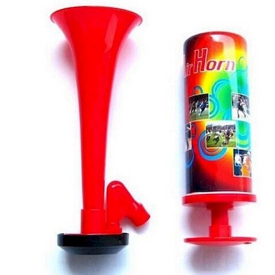 This Manually Pumped Air Horn is Made of Plastic. Great for Parties, Sporting Events, Games.