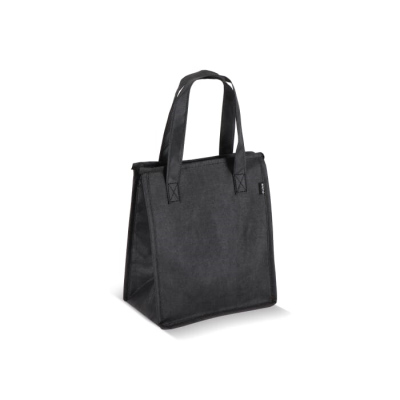 5Cm 75G & M² in Black. Lunch Cool Bag Made From Recycled Pet Non-Woven Material (75G & M²) with Aluminium Metal Foil Lining. Compact & Practical. Minimum Quantities Apply.