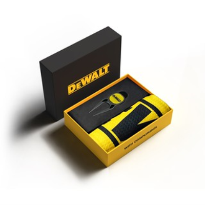 Towel & Quatro Repair Tool Mini Presentation Box Customised. Includes a Card Box (400 Gsm Paper From Sustainably Managed Forests) Which is Fully Customised with Your Logo Printed Up to Full Colour Packed with 1 x Dormi Players (Tt7002 Open Towel) or Dormi Tri Folding Towel (Tt7003) Printed Up to Full Colour on 1 Side & 1 x Quatro Repair Tool with 26Mm Gunmetal Removable Up to Full Colour Resin Dome Ball Marker. the Tool is Sat in an Eva Insert in the Box. Towel Upgrade to Either a Waffle Embroidered Towel or a Rear Background Print on the Dormi Towel Available for Additional Costs Box : Any CMYK Colour. Towel : White. Tool : Gunmetal Minimum Quantity: 48