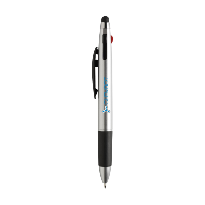 3-Colour Ball Pen with Rubber Top & Pointer to Operate Touch Screens (Eg Iphone & Ipad), Metallic Look Holder, Silver Trim & Rubber Grip. Equipped with a Blue, Red & Black Fill. Minimum Quantity: 1
